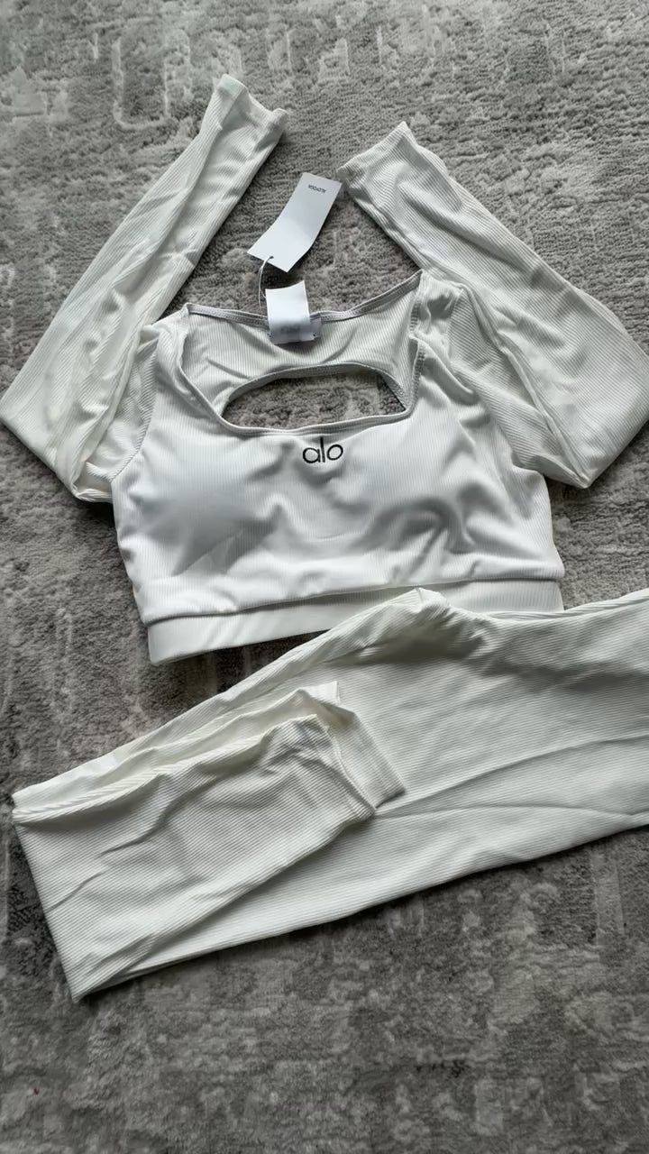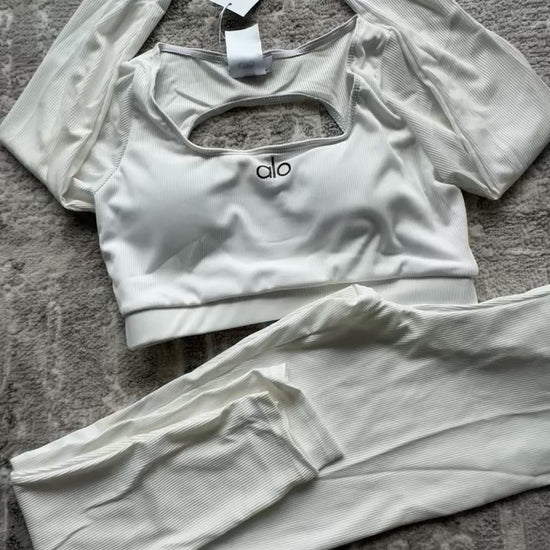 Alo White Ribbed Activewear Set – Long Sleeve Crop Top & High-Waist Legging