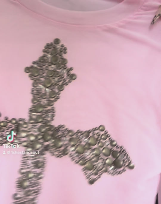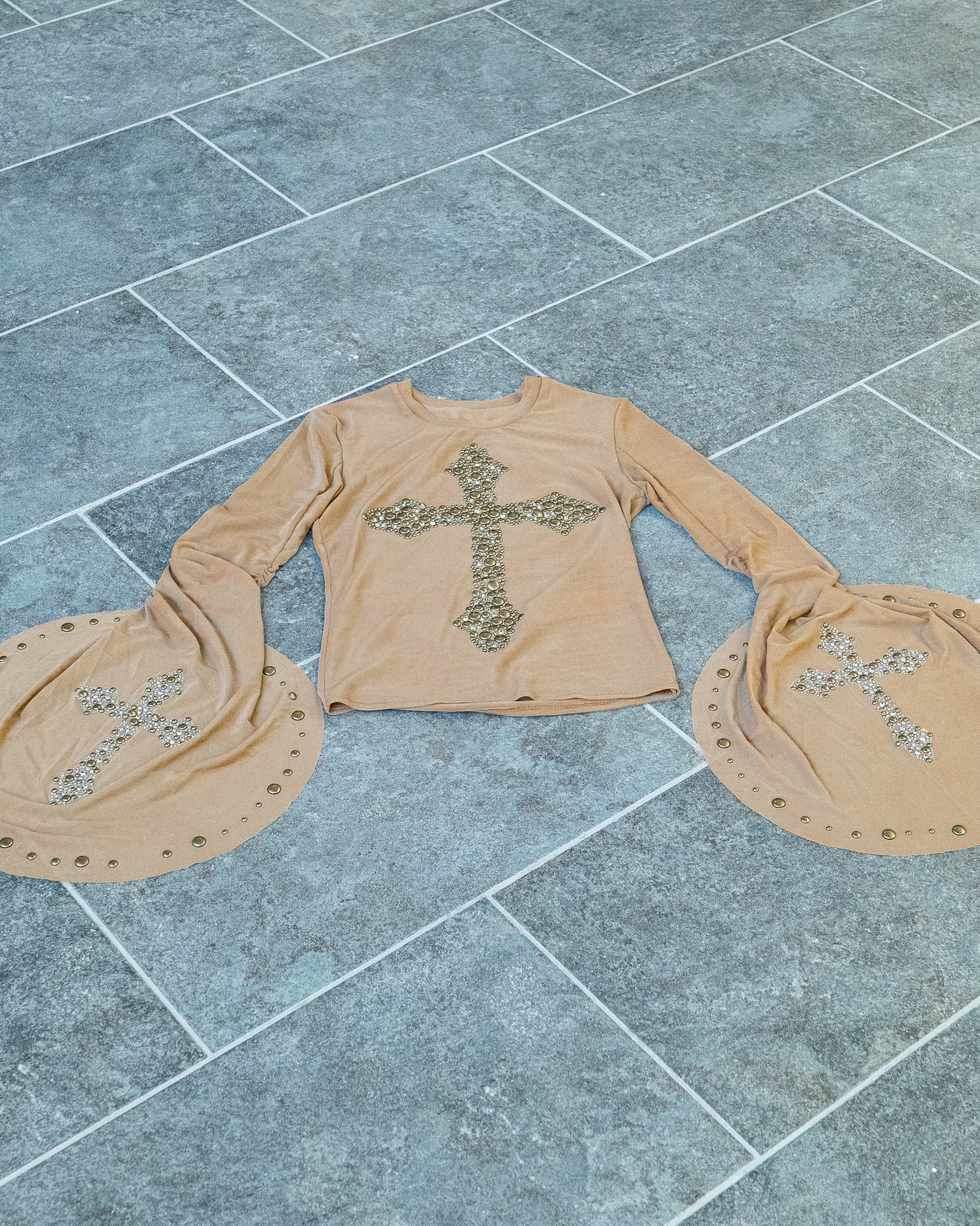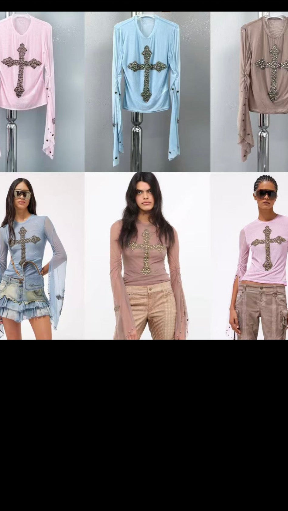 Y2K Cross Mesh Long Sleeve Top – Crystal Studded Sheer Shirt with Flared Sleeves